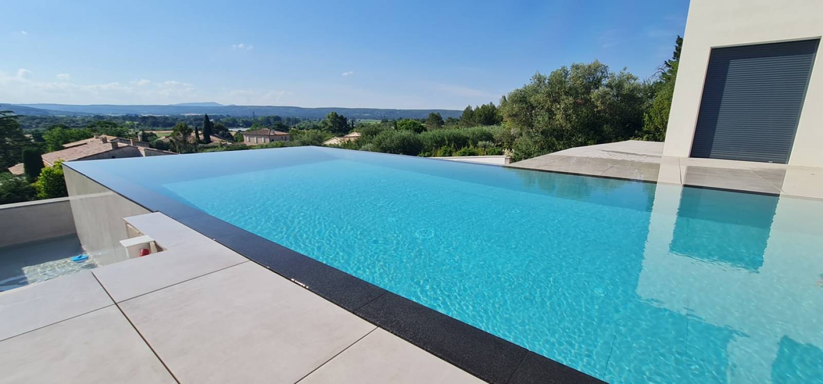 Construisez votre piscine d'exception avec plage immergée et débordement à Montpellier. Construction de piscine avec un procédé unique de système à banche, le béton est fibré sans ferraillage. Nous allons retrouver plusieurs bonde de fond pour une meilleure aspiration, skimmer miroir.