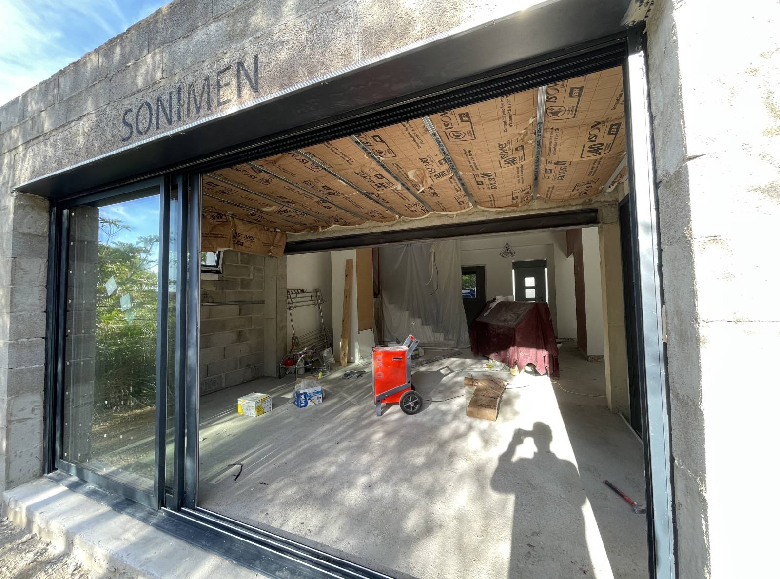 Pose d'une baie vitrée coulissante à triple vantail : extension de maison à Saint Etiennes du Grès dans le secteur des Alpilles proche d'Arles.